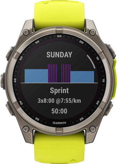 Garmin Fenix 8 Solar Titanium 47mm Αδιάβροχο Smartwatch με Παλμογράφο (Sapphire, Titanium With Amp Yellow/Graphite Silicone Band) 0753759339364