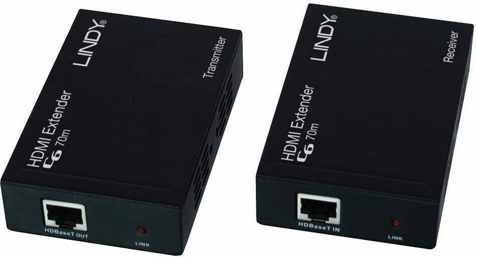 Σύστημα σχεδιασμένο για τη μετάδοση σήματος HDMI μέσω RJ45, της εταιρείας Lindy. Σε μαύρο χρώμα.